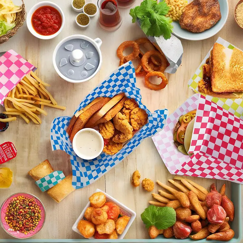 NINGBO POWERR PLASTIC PRODUCTS CO., Ltd는 중국에서 창의적인 미국식 38*28cm 햄버거 종이를 제공합니다. 내유성, 방수성 및 접착 방지 기능을 갖춘 전문 식품 포장지입니다. 햄버거, 샌드위치, 튀긴 음식, 구운 음식, 과일, 쿠키, 구운 음식 등을 포장하는 데 사용할 수 있습니다. 또한 임시 코스터, 보관 용기, 수제 재료, 사진 소품, 활동 소품 등도 될 수 있습니다. 다양한 라이프 스타일로 인해 창의성의 활용도가 더욱 높아졌습니다. 이 제품에 대한 새로운 디자인이 있는 경우 개발을 위해 언제든지 당사와 협력하시기 바랍니다.